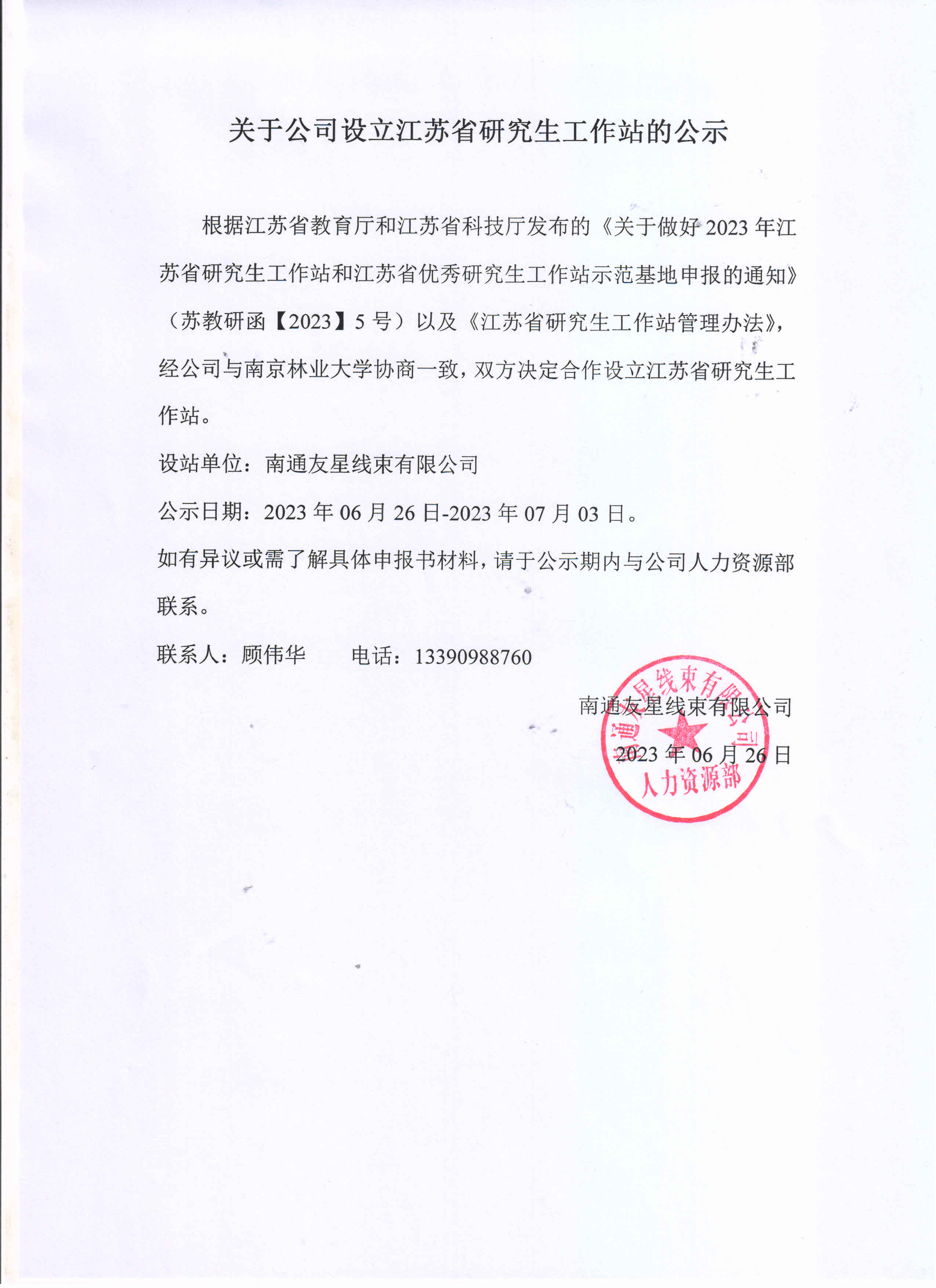關(guān)于公司設(shè)立江蘇省研究生工作站的公示